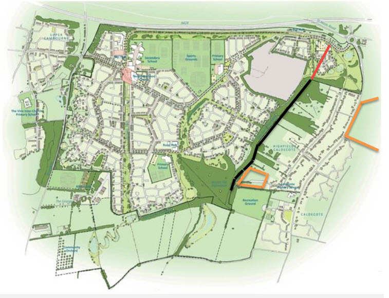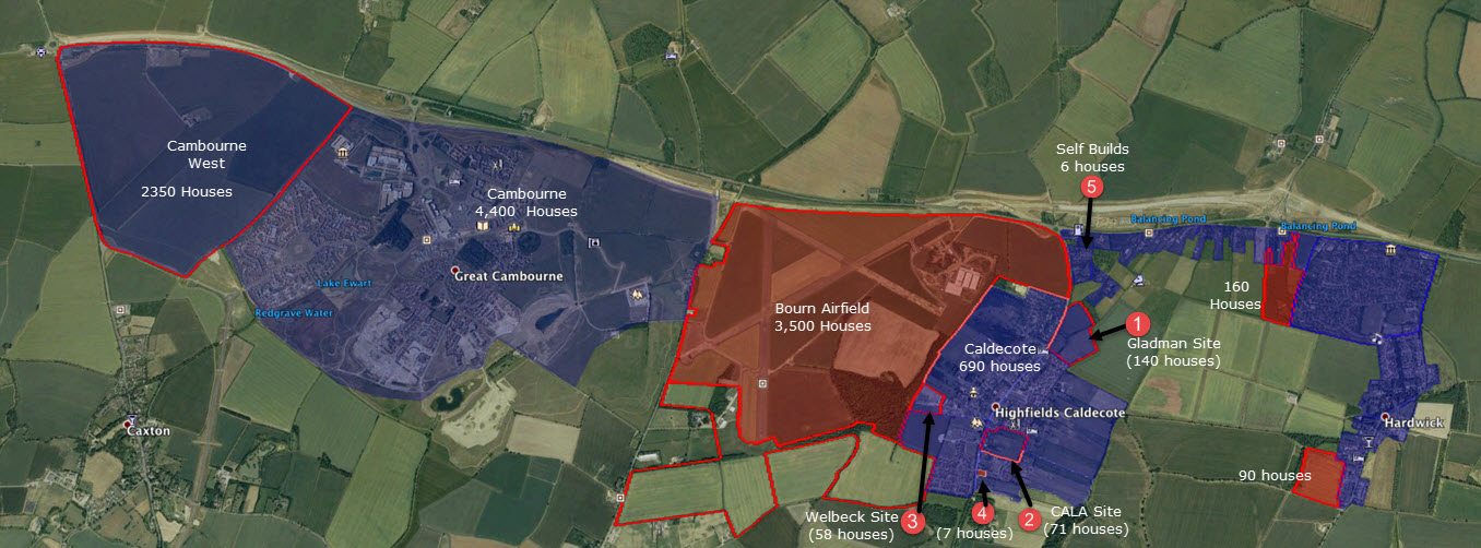 The area outlined in orange at bottom of Caldecote is the new extension of Grafton Drive for 58 houses, granted by the Appeal Inspector in December 2017. It comes right to the boundary of Bourn Airfield. So like it or not, we will be joined up there.